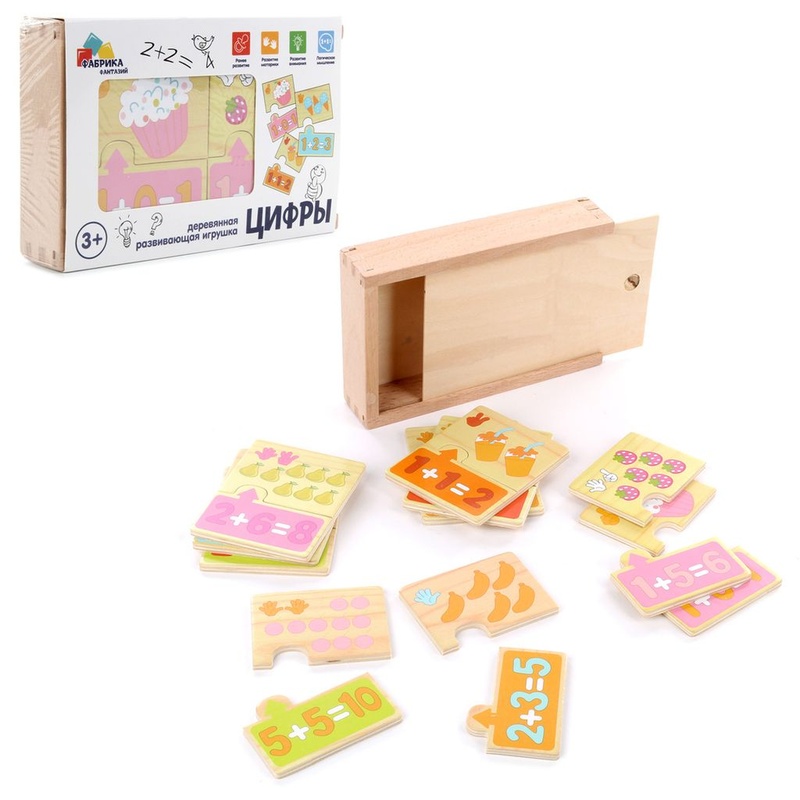 Научиться счету легко и просто, когда есть такая игрушка! Набор состоит из ящичка с крышкой, в котором помещаются 10 разбирающихся картинок-пластин с примерами. Каждая картинка состоит из 2 частей, они складываются по принципу пазла. В нижней части картинки написан арифметический пример, в верхней он проиллюстрирован изображением. Также есть изображение ручек, на пальцах показывающих число в примере. С этим игровым набором ребенок легко научится считать, составлять примеры, будет развивать визуальное восприятие, логическое мышление, мелкую моторику ручек и координацию движений. Все детали игрушки очень качественно обработаны, не имеют сколов и зазубрин. Деревянные игрушки торговой марки "Фабрика фантазий" способствуют всестороннему развитию малыша! Игрушка изготовлена из экологически чистой древесины, упакована в деревянный ящичек. Размеры пластины-пазла: 7*0,5*9 см. Размеры ящичка-упаковки: 17*3,5*11 см.