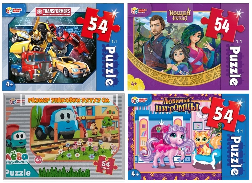 Пазлы 54Д "Микс" любимые питомцы/трансформеры/грузовичок лёва/кощей начало.