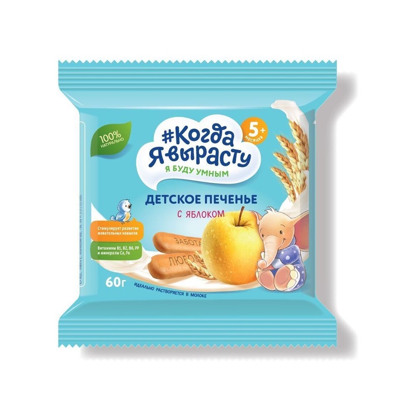 Печенье детское Когда Я вырасту, с яблоком, с витаминами, растворимое, с 5 мес., 60 гр. Когда Я вырасту - первый российский бренд для заботливых мам, которые выбирают для своих малышей полезные и безопасные продукты! •стимулирует развитие жевательных навыков; •способствует развитию вкусовых ощущений; •размер печенья Стандарт; •не содержит трансжиров; •не содержит красителей, консервантов; •не содержит ГМО, сою; •содержит натуральное молоко; •идеально растворяется в молоке; •обогащено витаминами (В1, В2, В6, РР); •обогащено минерами (Са, Fe); Печенье с яблоком - это сбалансированный и полезный детский продукт питания или дополнительного прикорма для детей старше 5 месяцев. Разнообразные форматы печенья от мини-мини, которые так удобно держать маленькими детскими ручками, до стандартных с забавными надписями на каждом из них, превратят процесс питания в развлечение! Печенье производится на новейшем современном заводе с соблюдением высоких требований к качеству детского питания. Меры предосторожности: Печенье можно употреблять в сухом виде или разводить теплым молоком, чаем или водой. Для кормления растворите из расчета 2 печенья на 100 мл теплого молока (чая, воды), тщательно перемешайте и кормите из бутылочки или ложечки. Упаковка: герметичный пакет (flow-pack), вес 60 грамм. Условия хранения: не более 12 месяцев. При температуре 18±5 °С и относительной влажности воздуха не более 65%. После вскрытия продукт хранить в сухом прохладном месте, но не в холодильнике, не более 3 недель. Состав: мука пшеничная, сахар, масло растительное, молоко сухое обезжиренное, порошок яблочный, солод ячменный, разрыхлители (гидрокарбонат аммония, гидрокарбонат натрия, натрия дифосфат), инулин, карбонат кальция, соль пищевая, лецитин, витаминно-минеральный премикс (железа фумарат, ниацинамид, пироксин годрохлорид, тиамин гидрохлорид, рибофлавин), ароматизатор натуральный яблочный. Внимание! Не оставляйте ребенка одного во время еды без присмотра! Перед введением в рацион печенья проконсультируйтесь у педиатра. Бренд: Когда я вырасту. Страна: Россия.