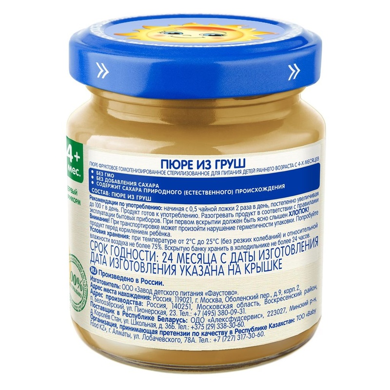 Бабушкино лукошко Пюре Груша с 4 мес., 100 г Пюре фруктовое гомогенизированное стерилизованное для питания детей раннего возраста Рекомендуется в качестве первого фруктового прикорма. • - без сахара • - монопродукт • - с 4 месяцев • - низкоаллергенный продукт Состав продукта Пюре из груш. Без ГМО. Без добавления сахара. Содержит сахара природного (естественного) происхождения. Рекомендации по употреблению Пюре рекомендуется употреблять начиная с 0,5 чайной ложки 2 раза в день, постепенно увеличивая до 100 г в день. Продукт готов к употреблению. Разогревать продукт в соответствии с правилами эксплуатации бытовых приборов. Упаковка Продукт расфасован в стеклянные баночки массой нетто 100г. При первом вскрытии должен быть ясно слышен ХЛОПОК! Пищевая ценность В 100 г продукта: углеводы - 15,5 г; минеральные вещества: калий - 90-200 мг, энергетическая ценность - 60 ккал/250 кДж. Срок хранения Закрытая баночка хранится при температуре от +2°С до +25°С (без резких колебаний) и относительной влажности воздуха не более 75% в течение 24 месяцев с даты изготовления. Содержимое открытой баночки может храниться в холодильнике не более 24 часов. Полезные свойства Груша - ценный источник витаминов, минералов, фруктовых кислот и пищевых волокон. Высокое содержание фолиевой кислоты, цинка, железа улучшает кроветворение. Сочетание дубильных веществ и пектинов в мякоти нормализует работу ЖКТ, оказывает легкое закрепляющее действие. Бренд Бабушкино лукошко Страна-производитель Россия
