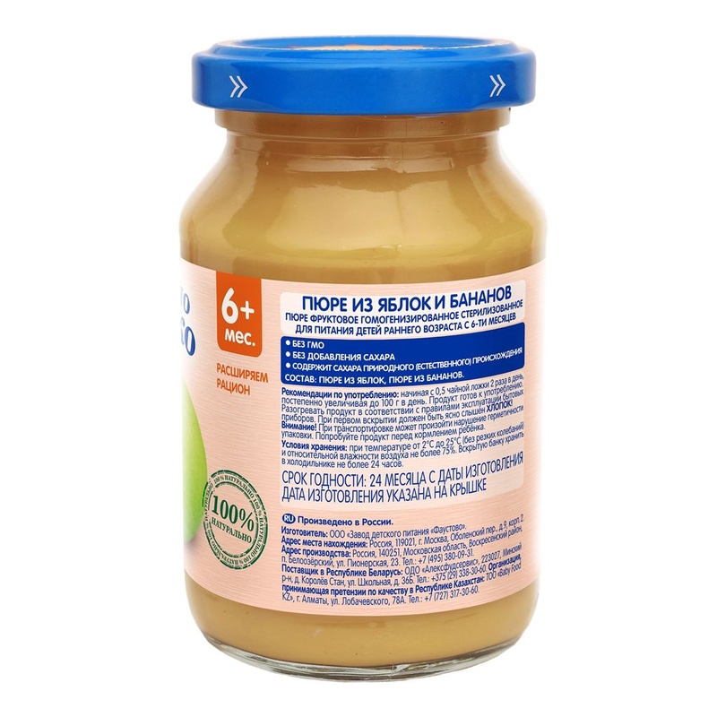 Бабушкино лукошко Пюре фруктовое из яблок и бананов 190 г с 6 мес. Пюре фруктовое гомогенизированное стерилизованное для питания детей раннего возраста Отсутствие сахара в пюре соответствует последним рекомендациям детских диетологов и позволяет сформировать привычки здорового питания с самого раннего возраста. • - без сахара • - без соли • - с 6 месяцев Состав продукта Пюре из яблок, пюре из бананов. Без ГМО. Без добавления сахара. Рекомендации по употреблению Пюре рекомендуется употреблять, начиная с 0,5 чайной ложки 2 раза в день, постепенно увеличивая до 100 г в день. Продукт готов к употреблению. Разогревать продукт в соответствии с правилами эксплуатации бытовых приборов. Упаковка Продукт расфасован в стеклянные баночки массой нетто 190г. При первом вскрытии должен быть ясно слышен ХЛОПОК! Пищевая ценность В 100 г продукта: углеводы - 16,4 г; минеральные вещества: калий - 80-300 мг, энергетическая ценность - 65 ккал/270кДж. Срок хранения Закрытая баночка хранится при температуре от +2°С до +25°С (без резких колебаний) и относительной влажности воздуха не более 75% в течение 24 месяцев с даты изготовления. Содержимое открытой баночки может храниться в холодильнике не более 24 часов. Полезные свойства Пюре из яблок и бананов содержит пектины, калий, магний, витамины А, С и В6. Способствует нормализации процесса пищеварения. Страна-производитель Россия Бренд Бабушкино лукошко