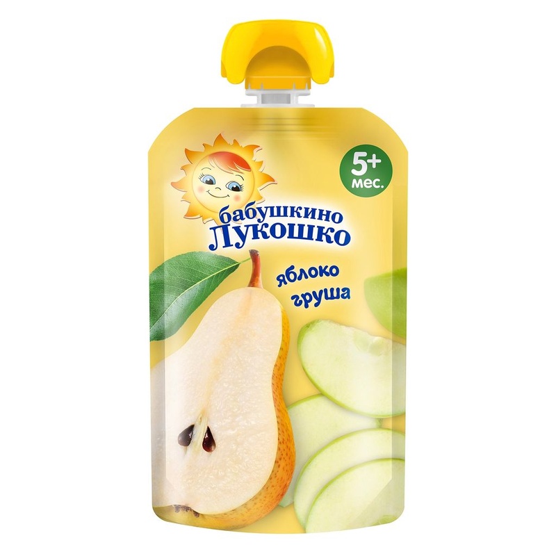 Бабушкино лукошко Пюре яблоко груша с 5 мес фруктовое гомогенизированное стерилизованное для питания детей раннего возраста Вкусное и полезное пюре в мягкой упаковке удобно взять с собой в дорогу, на прогулку, в гости. • - без сахара • - с 5 месяцев Состав продукта Пюре из груш, пюре из яблок. Без ГМО. Без добавления сахара. Содержит сахара природного (естественного) происхождения. Рекомендации по употреблению Пюре рекомендуется употреблять начиная с 0,5 чайной ложки 2 раза в день, постепенно увеличивая до 100 г в день. Продукт готов к употреблению. Упаковка Масса нетто - 90 г. ВАЖНО: не разогревать упаковку в микроволновой печи. Не оставляйте детей без присмотра во время использования продукта! Соблюдайте осторожность, так как попадание колпачка в рот ребенка опасно и может привести к затруднению дыхания! Пищевая ценность В 100 г продукта: углеводы - 15,5 г; минеральные вещества: калий -80-200мг; энергетическая ценность - 60 ккал/250 кДж. Срок хранения 12 месяцев с даты изготовления. Закрытый пакет хранится при температуре от +2°С до +25°С и относительной влажности воздуха не более 75%. Открытый пакет может храниться в холодильнике не более 24 часов. Полезные свойства Груша и яблоко - источники фруктовых кислот, витамина С, пищевых волокон, железа, пектина. Пюре способствует нормализации работы кишечника. Бренд Бабушкино лукошко Страна-производитель Россия
