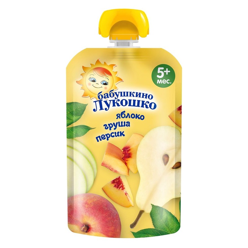 Пюре Бабушкино Лукошко Яблоко, груша и персик с 5 мес. 90 г (пауч). Пюре фруктовое гомогенизированное стерилизованное для питания детей раннего возраста Вкусное и полезное пюре в мягкой упаковке удобно взять с собой в дорогу, на прогулку, в гости. • - без сахара • - с 5 месяцев Состав продукта Пюре из яблок, пюре из груш, пюре из персиков Рекомендации по употреблению Продукт готов к употреблению. Упаковка Масса нетто - 90 г. ВАЖНО: не разогревать упаковку в микроволновой печи. Не оставляйте детей без присмотра во время использования продукта! Соблюдайте осторожность, так как попадание колпачка в рот ребенка опасно и может привести к затруднению дыхания! Пищевая ценность В 100 г продукта: углеводы - 15,5 г; минеральные вещества: калий - 80-250 мг, энергетическая ценность - 60 ккал/250кДж. Срок хранения 12 месяцев с даты изготовления. Закрытый пакет хранится при температуре от +2°С до +25°С и относительной влажности воздуха не более 75%. Открытый пакет может храниться в холодильнике не более 24 часов. Полезные свойства Яблоко - источник фруктовых кислот, витамина С, железа, пектинов. Сочетание железа и витамина С способствует наилучшему всасыванию железа в кишечнике, что является профилактикой анемии. Пектины и фруктовые кислоты мягко стимулируют деятельность желудочно-кишечного тракта. В груше содержится огромное количество полезных веществ - каротин, фолиевая кислота, железо, марганец, йод, медь, калий, магний, натрий, фосфор, цинк, фтор, молибден, пектины и органические кислоты, витамины А, вся группа витаминов В, С, Е, РР. Груша полезна для зрения, нервной системы, формирования костно-мышечной системы. Персик содержит органические кислоты и микрожлементы, такие как калий, железо, фосфор, марганец, медь, цинк, селен и магний, витаминный комплекс: витамин С, витамины группы В, Е, К, РР, а также каротин. Персик способствует повышению иммунитета, укреплению сердечной мышцы, улучшает работу желудочно-кишечного тракта, ускоряет обмен веществ. Бренд Бабушкино лукошко Страна-производитель Россия