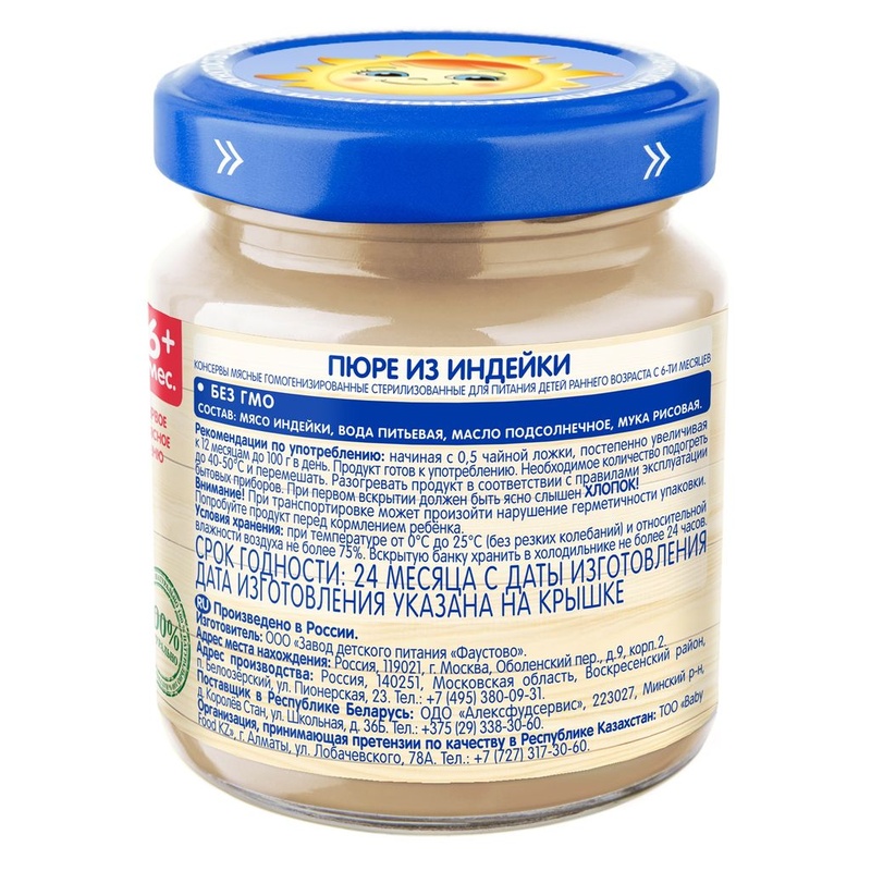 Бабушкино лукошко Пюре Индейка с 6 мес., 100 г Пюре мясное гомогенизированное стерилизованное для питания детей раннего возраста Мясные пюре - источник полноценного белка и гемового железа, которое наиболее полно усваивается организмом. Способствуют профилактике анемии. • - без соли • - с 6 месяцев • - низкоаллергенный продукт Состав продукта Мясо индейки, масло подсолнечное, мука рисовая, вода питьевая. Без ГМО. Без добавления соли. Рекомендации по употреблению Пюре рекомендуется употреблять начиная с 0,5 чайной ложки, постепенно увеличивая к 12 месяцам до 100 г в день. Продукт готов к употреблению. Необходимое количество подогреть до 40-50°С и перемешать. Разогревать продукт в соответствии с правилами эксплуатации бытовых приборов. Упаковка Продукт расфасован в стеклянные баночки массой нетто 100г. При первом вскрытии должен быть ясно слышен ХЛОПОК! Пищевая ценность В 100 г продукта: белки – 9,5 г; жиры – 8,0 г; энергетическая ценность - 110 ккал/460 кДж. Срок хранения Закрытая баночка хранится при температуре от 0°С до +25°С (без резких колебаний) и относительной влажности воздуха не более 75% в течение 24 месяцев с даты изготовления. Содержимое открытой баночки может храниться в холодильнике не более 24 часов. Полезные свойства Индейка – нежное мясо с низкими аллергенными свойствами. Добавление в пюре рисовой крупы и растительного масла обогащает питание ребенка углеводами и витаминами Е, В2. Бренд Бабушкино лукошко Страна-производитель Россия