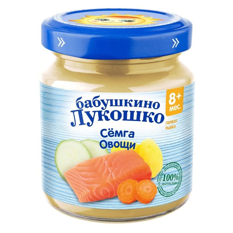 Бабушкино лукошко Рагу из семги с овощами пюре с 8 мес., 100 г Пюре растительно-рыбное пюреобразное стерилизованное для питания детей раннего возраста Рыба - основной источник полиненасыщенных жирных кислот (Омега 3), жирорастворимых витаминов и фосфора, необходимых для развития интеллекта малыша в раннем возрасте. • - с 8 месяцев Состав продукта Картофель, пюре из кабачков, филе сёмги, пюре из моркови, масло подсолнечное, лук, соль, вода питьевая. Без ГМО. Рекомендации по употреблению Пюре рекомендуется употреблять начиная с 0,5 чайной ложки, постепенно увеличивая до 100 г в день. Продукт готов к употреблению. Необходимое количество подогреть до 40-50°С и перемешать. Разогревать продукт в соответствии с правилами эксплуатации бытовых приборов. Упаковка Продукт расфасован в стеклянные баночки массой нетто 100г. При первом вскрытии должен быть ясно слышен ХЛОПОК! Пищевая ценность В 100 г продукта: белки, не менее - 3,2 г; жиры, не более - 6,0 г; углеводы - 10,0 г; энергетическая ценность - 107 ккал/450 кДж. Срок хранения Закрытая баночка хранится при температуре от 0°С до +25°С (без резких колебаний) и относительной влажности воздуха не более 75% в течение 18 месяцев с даты изготовления. Содержимое открытой баночки может храниться в холодильнике не более 24 часов. Полезные свойства Рагу из сёмги с овощами богато витаминами (A, D, E) и минералами (железом, фосфором, кальцием, магнием, цинком, селеном). Овощи, входящие в состав пюре, обогащают его пищевыми волокнами и витаминами группы В, которые необходимы для роста и развития малыша. Бренд Бабушкино лукошко Страна-производитель Россия