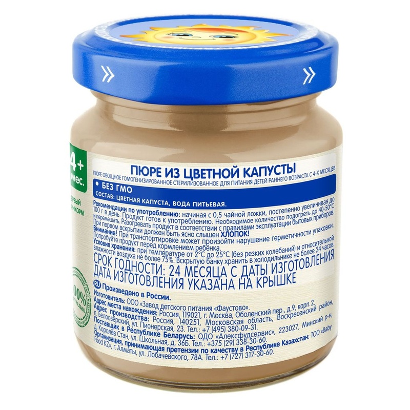 Бабушкино лукошко Пюре Цветная капуста с 4 мес., 100 г Пюре овощное гомогенизированное стерилизованное для питания детей раннего возраста Рекомендуется в качестве первого овощного прикорма. • - монопродукт • - без соли • - с 4 месяцев • - низкоаллергенный продукт Состав продукта Цветная капуста, вода питьевая. Без ГМО. Без добавления соли. Рекомендации по употреблению Пюре рекомендуется употреблять начиная с 0,5 чайной ложки, постепенно увеличивая до 100 г в день. Продукт готов к употреблению. Необходимое количество подогреть до 40-50°С и перемешать. Разогревать продукт в соответствии с правилами эксплуатации бытовых приборов. Упаковка Продукт расфасован в стеклянные баночки массой нетто 100г. При первом вскрытии должен быть ясно слышен ХЛОПОК! Пищевая ценность В 100 г продукта: углеводы - 4,0 г; минеральные вещества: калий -70-300 мг, энергетическая ценность - 15 ккал/60 кДж. Срок хранения Закрытая баночка хранится при температуре от +2°С до +25°С (без резких колебаний) и относительной влажности воздуха не более 75% в течение 24 месяцев с даты изготовления. Содержимое открытой баночки может храниться в холодильнике не более 24 часов. Полезные свойства Цветная капуста - это низкоаллергенный продукт, содержащий нежную растительную клетчатку, не раздражающую слизистую кишечника, и целый комплекс витаминов (С, Е, РР) и минералов (калий, фосфор, железо, магний, йод), необходимых для растущего организма. Бренд Бабушкино лукошко Страна-производитель Россия