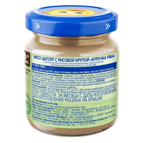 Бабушкино лукошко Пюре Мясо цыплят с рисом с 6 мес., 100 г Пюре мясорастительное гомогенизированное стерилизованное для питания детей раннего возраста Благодаря оптимальному сочетанию мяса с овощами и крупами меню малыша всегда будет разнообразным и полноценным. • - без соли • - с 6 месяцев Состав продукта Мясо цыплят, мука рисовая, масло подсолнечное, вода питьевая. Без ГМО. Без добавления соли. Рекомендации по употреблению Пюре рекомендуется употреблять начиная с 0,5 чайной ложки, постепенно увеличивая к 12 месяцам до 100 г в день. Продукт готов к употреблению. Необходимое количество подогреть до 40-50°С и перемешать. Разогревать продукт в соответствии с правилами эксплуатации бытовых приборов. Упаковка Продукт расфасован в стеклянные баночки массой нетто 100г. При первом вскрытии должен быть ясно слышен ХЛОПОК! Пищевая ценность В 100 г продукта: белки - 5,5 г; жиры - 6,0 г; углеводы – 6,5 г; энергетическая ценность – 100 ккал/420 кДж. Срок хранения Закрытая баночка хранится при температуре от 0°С до +25°С (без резких колебаний) и относительной влажности воздуха не более 75% в течение 24 месяцев с даты изготовления. Содержимое открытой баночки может храниться в холодильнике не более 24 часов. Полезные свойства Цыплёнок – источник полноценного и легкоусвояемого белка, необходимого для роста ребенка, витаминов А и Е, магния. Рис обогащает пюре углеводами и витаминами группы В. Бренд Бабушкино лукошко Страна-производитель Россия