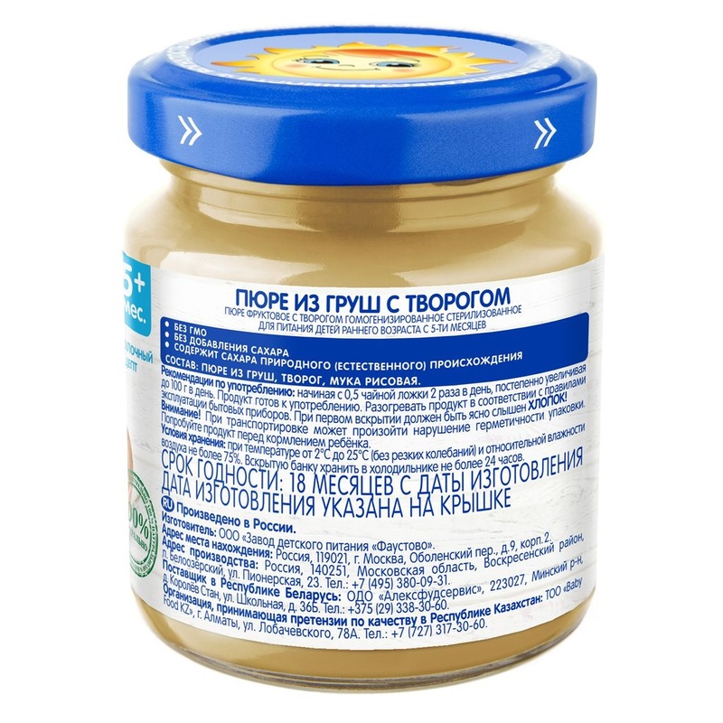 Нет в наличии ОтсутствуетБабушкино лукошко Пюре Груша с творогом с 5 мес., 100 г Пюре фруктовое с творогом гомогенизированное стерилизованное для питания детей раннего возраста Фруктово-творожные пюре «Бабушкино Лукошко» прекрасно подойдут для полдника вашего малыша. • - без сахара • - с 5 месяцев Состав продукта Пюре из груш, творог, мука рисовая. Без ГМО. Без добавления сахара. Содержит сахара природного (естественного) происхождения. Рекомендации по употреблению Пюре рекомендуется употреблять начиная с 0,5 чайной ложки 2 раза в день, постепенно увеличивая до 100 г в день. Продукт готов к употреблению. Разогревать продукт в соответствии с правилами эксплуатации бытовых приборов. Упаковка Продукт расфасован в стеклянные баночки массой нетто 100г. При первом вскрытии должен быть ясно слышен ХЛОПОК! Пищевая ценность В 100 г продукта: белки - 2,5 г; жиры - 1,7 г; углеводы - 14,0 г; минеральные вещества: калий - 70-120 мг; энергетическая ценность - 80 ккал/330 кДж. Срок хранения Закрытая баночка хранится при температуре от +2°С до +25°С (без резких колебаний) и относительной влажности воздуха не более 75% в течение 18 месяцев с даты изготовления. Содержимое открытой баночки может храниться в холодильнике не более 24 часов. Полезные свойства Фруктово-творожные пюре сочетают полезные свойства творога и фруктов. Груша - источник витамина С, фруктовых кислот, пищевых волокон. Высокое содержание фолиевой кислоты помогает кроветворению. Творог богат кальцием и фосфором, микроэлементами, которые участвуют в формировании костной ткани и зубов. Сочетание творога и фруктовых кислот улучшает усвояемость кальция и других полезных веществ. Продукты с творогом особенно полезны для детей с рахитом и низкой массой тела. Бренд Бабушкино лукошко Страна-производитель Россия