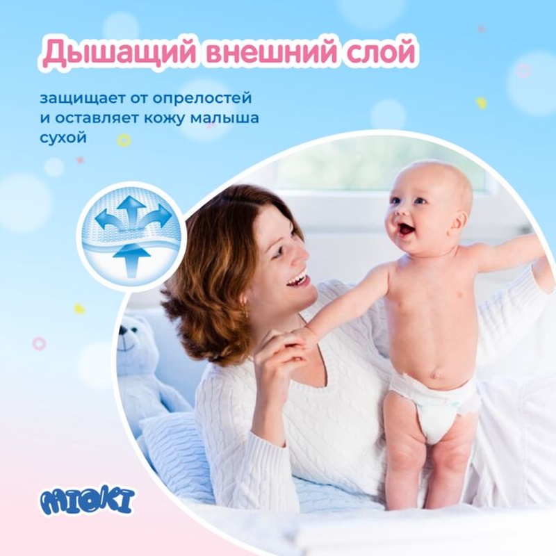 Подгузники "MIOKI" Нежные и надежные как объятия мамы. Настоящие японское качество. Внутренний слой - 100% гипоаллергенный хлопок. Впитывающий слой - super absorbent polymeric. Благодаря ему МIOKI удерживает на 10% больше влаги, чем подгузники других марок. Ваш малыш может ползать, бегать, кувыркаться, играть много часов подряд. Его кожа остается сухой, а одежда чистой. Высокая талия обеспечивает комфортную посадку. Эластичный пояс фиксирует подгузник, не сдавливая животик. Двойные складки вокруг ножек защищают от протекания. Мягкие швы не мешают движениям. Специальным образом обработанные края не натирают кожу. Складки на поясе пропускают воздух внутрь и препятствуют появлению опрелостей. Впитывающий слой равномерно распределяет жидкость, не топорщится и не собирается комками. Даже после многих часов ношения подгузники МIOKI не пропускают запах. Индикатор наполнения подскажет, когда подгузник следует поменять. Лента утилизации поможет свернуть использованный подгузник в комочек. Биоразлагаемая упаковка не вредит окружающей среде