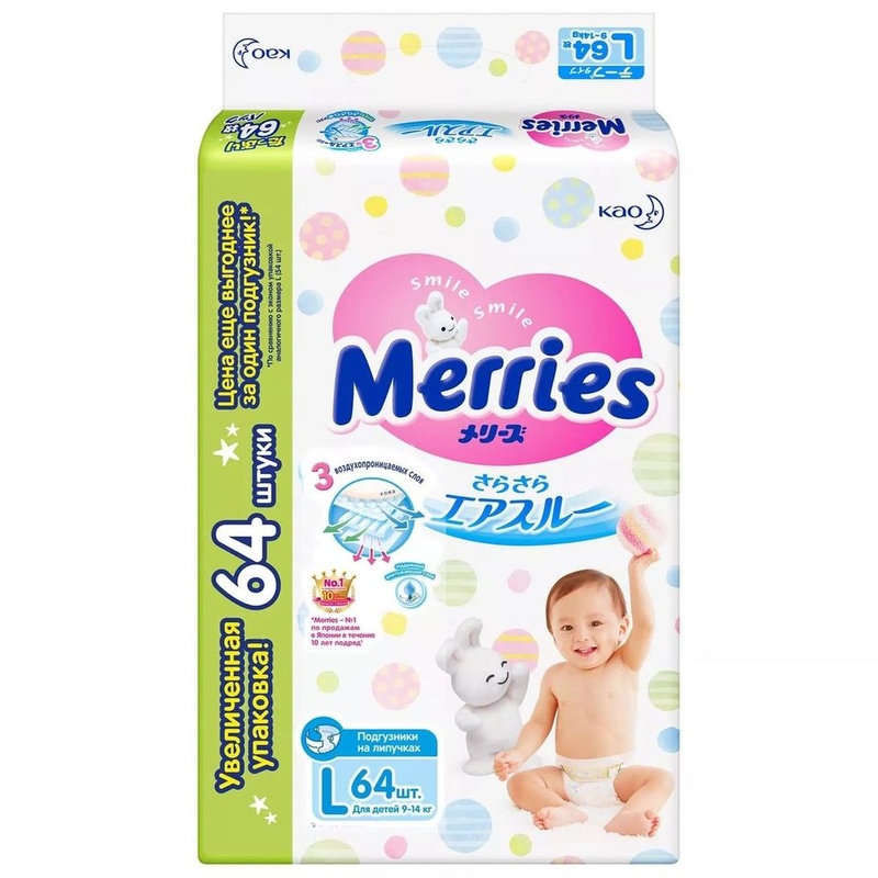 Подгузники "Merries" 9-14 кг (64/60 шт) / 2