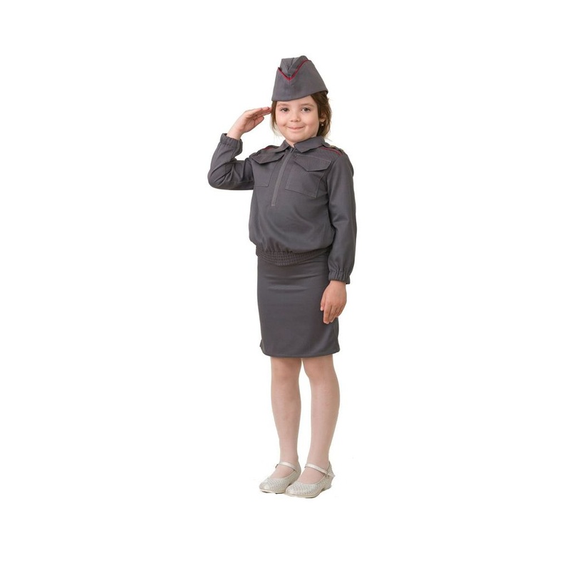 Карнавальный костюм Полицейская Арт.5709 Детский костюм полицейской будет настоящей находкой для праздника профессий или театрализованной постановки. Изделие сшито из практичного материала, повторяет оригинальный фасон формы и не ограничивает активных движений ребенка во время игр и конкурсов. Модельный ряд из шести размеров подойдет детям от дошкольного до среднего школьного возраста. Комплект состоит из куртки, юбки прямого кроя на резинке и пилотки, выполнен в сером цвете. Куртка свободного кроя с отложным воротником и застежкой-молнией в нижней части оформлена резинкой. Шеврон в виде флага Российской Федерации и форменный головной убор делают костюм завершенным. Бренд Батик Страна-изготовитель Россия.