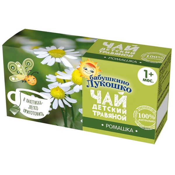 Бабушкино лукошко Детский чай Ромашка с 1 мес. 1 г х 20 пак Чай «Бабушкино Лукошко» содержит только натуральные травы. • - без сахара • - монопродукт • - с 1 месяцев Состав продукта Цветки ромашки. Без подсластителей и ГМО. Без добавления мальтодекстрина и ароматизаторов. Рекомендации по употреблению Чай рекомендуется употреблять в течение 2-3 недель с последующим перерывом 2-3 недели. Суточный объём чая не должен превышать объёма одного кормления. Детям от 1 года дневная норма - 1-2 чашки в сутки. 1 пакетик чая залить 100-150 мл горячей кипячёной воды и настоять 3-5 мин, затем пакетик удалить. Чай рекомендуется готовить непосредственно перед употреблением. Не забудьте остудить чай до температуры 36-37°С. Упаковка Чай расфасован в фильтр-пакеты по 1 грамму. В упаковке – 20 фильтр-пакетов. Пищевая ценность В 100 мл готового чая: энергетическая ценность - 1ккал/4 кДж. Срок хранения 12 месяцев с даты производства. До и после вскрытия упаковки хранить в сухом месте вдали от сильно пахнущих веществ, при относительной влажности воздуха не более 75%. Полезные свойства Цветки ромашки обладают противовоспалительным, спазмолитическим и легким успокоительным действием. Улучшают аппетит, уменьшают газообразование. Бренд Бабушкино лукошко Страна-производитель Россия