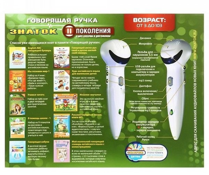 Нет в наличии ОтсутствуетДля мальчиков и девочек Цвет: белый. Комплект: говорящая ручка, сетевое зарядное устройство, USB-кабель, ремешок, книжка с аудиостикерами. . Из чего сделана игрушка (состав): пластик, металл, текстиль. . Размер упаковки: 31 х 22.5 х 10 см. Упаковка: картонная коробка. Длина ручки: 17 см. Диаметр подставки: 6.5 см. Длина ремешка: 40 см. Память ручки: 4 GB. Вес : 450 г. Страна обладатель бренда: Россия. "Ручка" от компании "Знаток" - это интересное электронное говорящее изделие, предназначенное для развития речевых способностей и памяти ребенка. В комплекте можно найти ремешок, подставку, зарядку и Usb-шнур. Ручка оснащена картой памяти 4 ГБ, в которой есть более 10 типов книг. Стоит коснуться концом ручки логотипа на обложке книги "Говорящая ручка" и она начнет воспроизводить сохраненные в ней файлы. Можно перелистывать книгу и касаться ею картинок или текста. Ручка также оснащена функциями Mp3-плеера и диктофона с разъемом для наушников и Usb-входом. В комплекте можно найти несколько аудиостикеров, на которые можно сделать звуковые записи. Внимание! Книги для воспроизведения данной ручкой с логотипом "Говорящая ручка" необходимо приобрести отдельно.