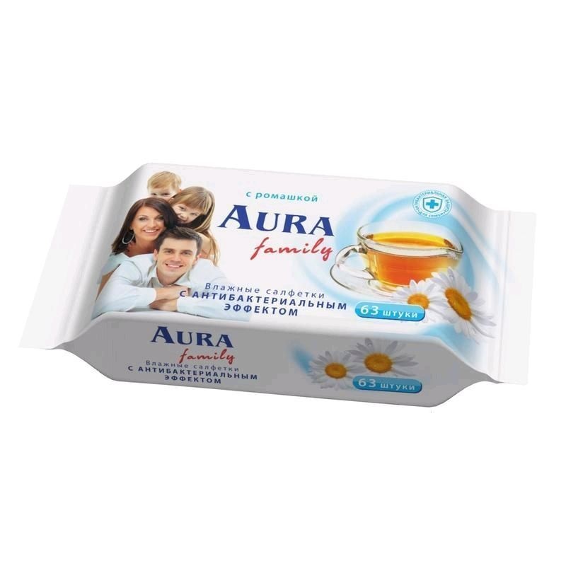 Влажные салфетки "Aura. Для всей семьи", освежающие, 63 штуки Салфетки влажные Aura освежающие для всей семьи обладают антибактериальным эффектом. Освежающие влажные салфетки эффективно очищают, надолго освежают и тонизируют. В составе пропитывающего салфетки лосьона — экстракт ромашки, обладающий противовоспалительными свойствами. В упаковке: 63 салфетки.