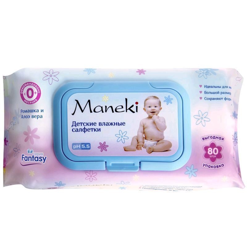 Нет в наличии ОтсутствуетManeki Салфетки Fantasy влажные с экстрактами Ромашки и Алоэ Вера 80 шт из нетканого материала (вискозы), с тиснением «жемчужинки». Особенности: Подходят детям с первых дней жизни Не содержат спирт, не вызывают раздражение кожи Упаковка с герметичным клапаном Размер листа: 180х200 мм