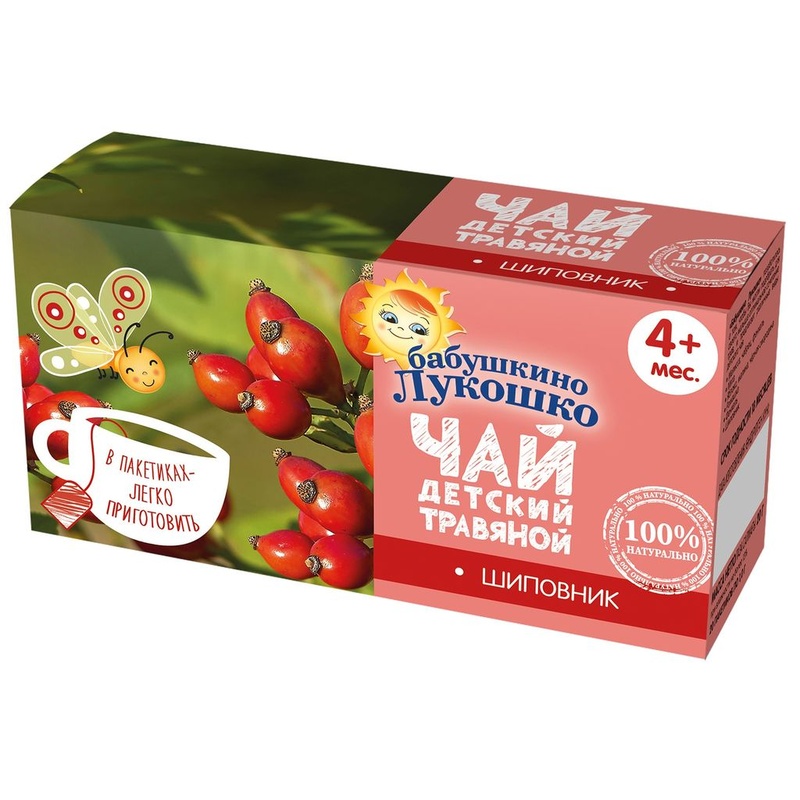 Бабушкино лукошко Детский чай Шиповник с 4 мес.1 г х 20 пак. Чай «Бабушкино Лукошко» содержит только натуральные травы. • - без сахара • - монопродукт • - с 4 месяцев Состав продукта Плоды шиповника. Без подсластителей и ГМО. Без добавления мальтодекстрина и ароматизаторов. Рекомендации по употреблению Чай рекомендуется употреблять в течение 2-3 недель с последующим перерывом 2-3 недели. Суточный объём чая не должен превышать объёма одного кормления. Детям от 1 года дневная норма - 1-2 чашки в сутки. 1 пакетик чая залить 100-150 мл горячей кипячёной воды и настоять 3-5 мин, затем пакетик удалить. Чай рекомендуется готовить непосредственно перед употреблением. Не забудьте остудить чай до температуры 36-37°С. Упаковка Чай расфасован в фильтр-пакеты по 1 грамму. В упаковке – 20 фильтр-пакетов. Пищевая ценность В 100 мл готового чая: энергетическая ценность - 1ккал/4 кДж. Срок хранения 18 месяцев с даты производства. До и после вскрытия упаковки хранить в сухом месте вдали от сильно пахнущих веществ, при относительной влажности воздуха не более 75%. Полезные свойства Плоды шиповника богаты каротиноидами, витаминами С и Е, железом, калием, марганцем, фосфором и магнием. Благодаря такому богатому составу биологически активных веществ чай из плодов шиповника обладает общетонизирующим действием, укрепляет иммунитет и способствует профилактике простудных заболеваний. Бренд Бабушкино лукошко Страна-производитель Россия