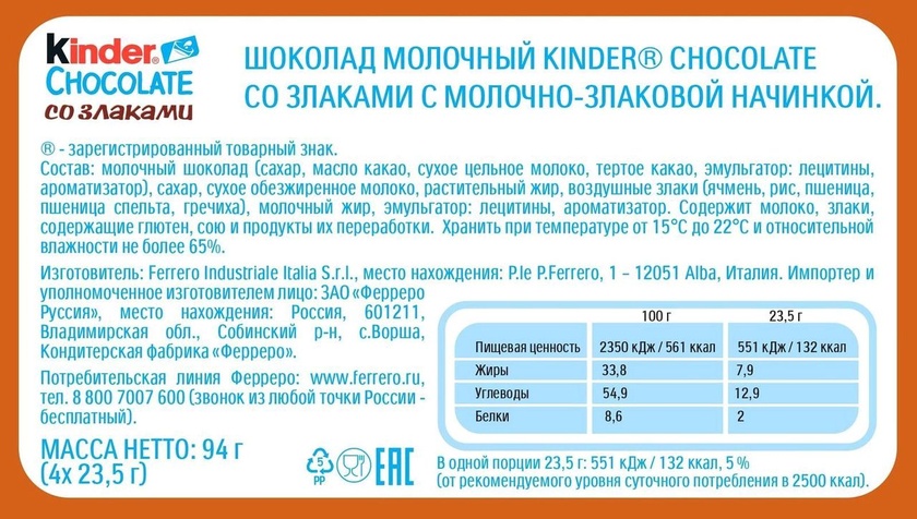 Шоколад "Киндер Кантри" злаки Т4/20