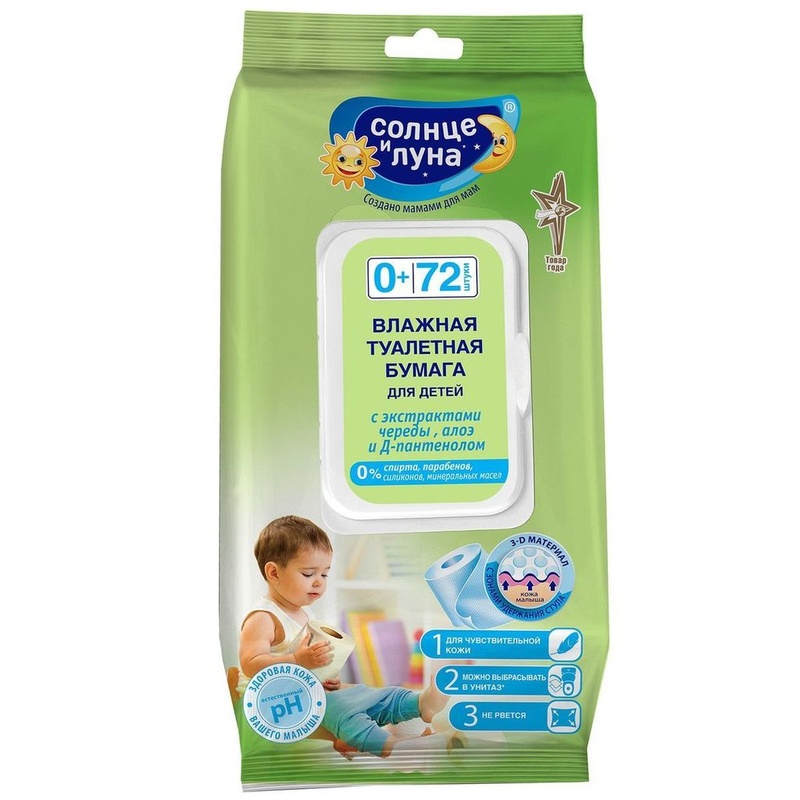 Туалетная бумага Солнце и луна влажная с экстрактом череды 72шт Влажная туалетная бумага «Солнце и Луна» изготовлена из ультрамягкого, особо нежного материала. Инновационная технология изготовления 3D-материала с зонами удержания стула обеспечивает более эффективное и экономичное использование туалетной бумаги. Загрязнения, попадая в особые углубления в материале бумаги, легко удаляются без дополнительных усилий, позволяя использовать меньшее количество листов. Нет необходимости протирать кожу несколько раз, благодаря чему снижается вероятность раздражений и покраснений кожи. Экстракты череды и алоэ в составе ухаживающего лосьона, которым пропитана туалетная бумага, оказывают противовоспалительное, антисептическое, успокаивающее действие на нежную кожу малыша. Д-Пантенол способствует заживлению кожи и защищает от раздражения. Упаковка с отверстием для подвешивания удобна в использовании дома и в путешествиях. Страна-производитель Россия Бренд: Солнце и луна