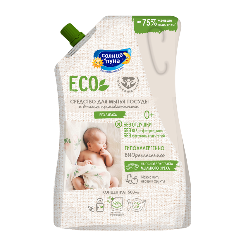 СОЛНЦЕ и ЛУНА ЭКО Ср-во д/мытья посуды без запаха, дой-пак 500мл 1/12