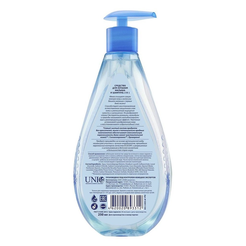 AQA baby Средство для купания и шампунь 2 в 1 не вызывает слез и не сушит нежную детскую кожу. Особенности: Для мягкого очищения волос и тела на основе воды из артезианского источника. Не сушит кожу Без парабенов Без слез Состав: глицерин, экстракт ромашки, вода, экстракт календулы, отдушка, экстракт лаванды, D-пантенол, молочный протеин, глицерил олеат, хлорид натрия, динатрия эдетат, бензиловый спирт, изотиазолинон, кокамидопропил бетаин, натрия кокоамфоацетат, натрия лаурет сульфат, натрия кокоглюкозид, натрия сульфосукцинат.