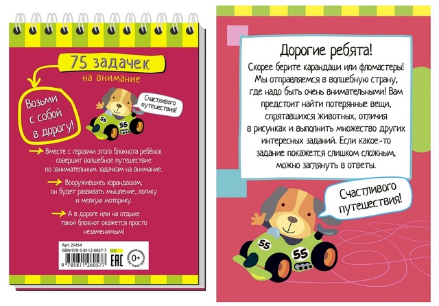Открыв этот блокнот, ребёнок попадёт в волшебную страну с задачками на внимание. Вооружившись карандашом, он будет искать спрятанные предметы, отличия в рисунках, ошибки художника, составлять пазлы и одновременно развивать внимание, мелкую моторику и мышление. А в дороге или на отдыхе такой блокнот будет просто незаменим. Адресовано детям от 5 лет.