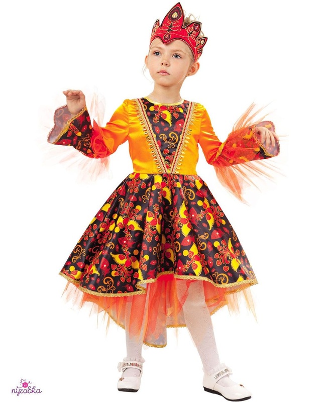 Особенности: Ассиметричное платье + подъюбник Длинный рукав-колокол Принт с русским народным узором Фатин на подоле и рукавах дополняет образ Кокошник с эластичной резинкой, напоминающий корону Характеристики: Материал: полиэстер Размеры: 28-34 Рост: 110-134