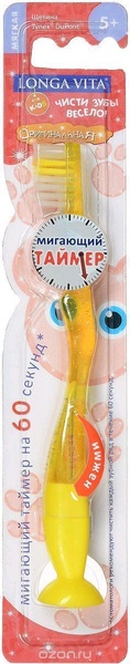 Зубная щетка Longa Vita оригинальная мигающая с присоской с 5 лет Детская зубная щетка Longa Vita "Забавные зверята" понравится ребенку с первого взгляда! Наконец-то чистить зубы - весело! Эргономичная ручка с противоскользящим покрытием имеет силовой выступ для большого пальца. Мигающий таймер помогает привить детям навыки чистки зубов: каждый зубной ряд необходимо чистить в течение 60 секунд. Таймер включается нажатием на нижнюю часть щетки и отключается автоматически через 60 секунд. В комплекте предусмотрены незаменяемые батарейки. Особенности: мигающий таймер; подставка-присоска; эргономичная ручка; противоскользящая поверхность ручки; силовой выступ для большого пальца; цветовое поле щетины для оптимального дозирования пасты; привлекательный дизайн.