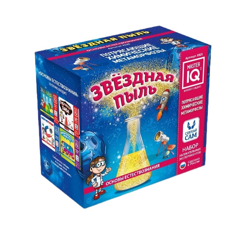 Набор "Звездная пыль" позволяет провести одну из самых красивых реакций в химии и любоваться ее результатом еще долгое время. Опыт основан на получении йодида свинца. Его особенность хорошо растворяться в горячей воде и мало растворяться в холодной позволяет получить при охлаждении раствора красивые золотые кристаллики, искрящиеся на солнечном свету. В ходе опыта юный химик узнает, что такое реакции обмена и гидролиза.